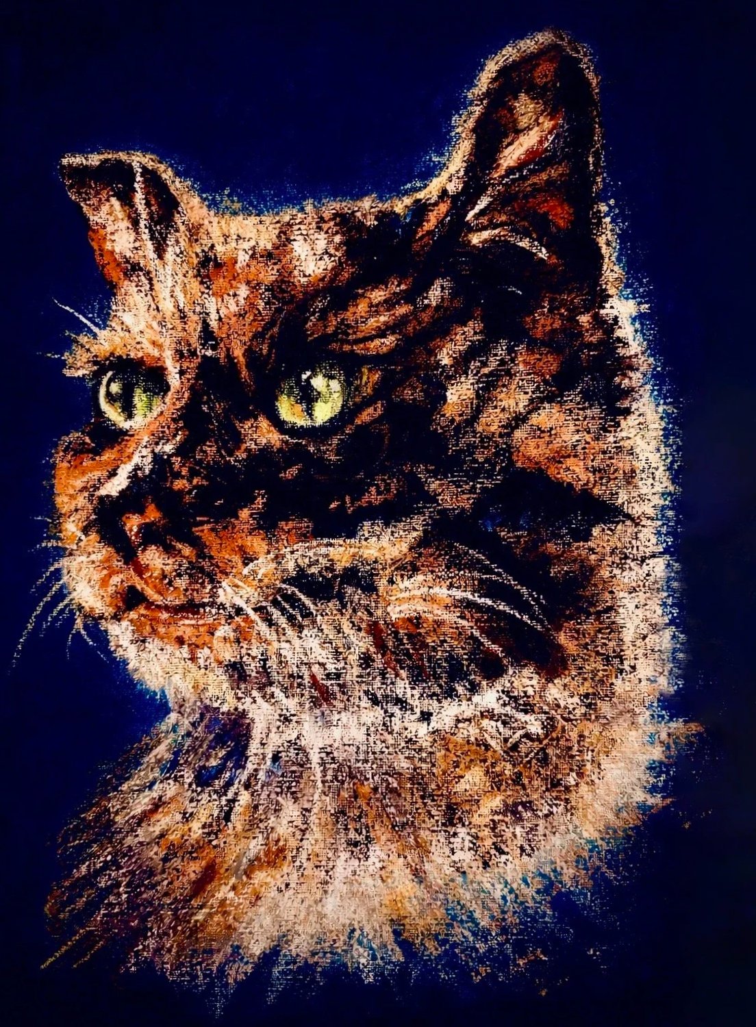 A sketch of my adorable calico cat. Painted with loose, textured marks to capture mood rather than detail. I wanted to capture a fleeting, attentive moment — the warmth of the fur and the intensity of the gaze.