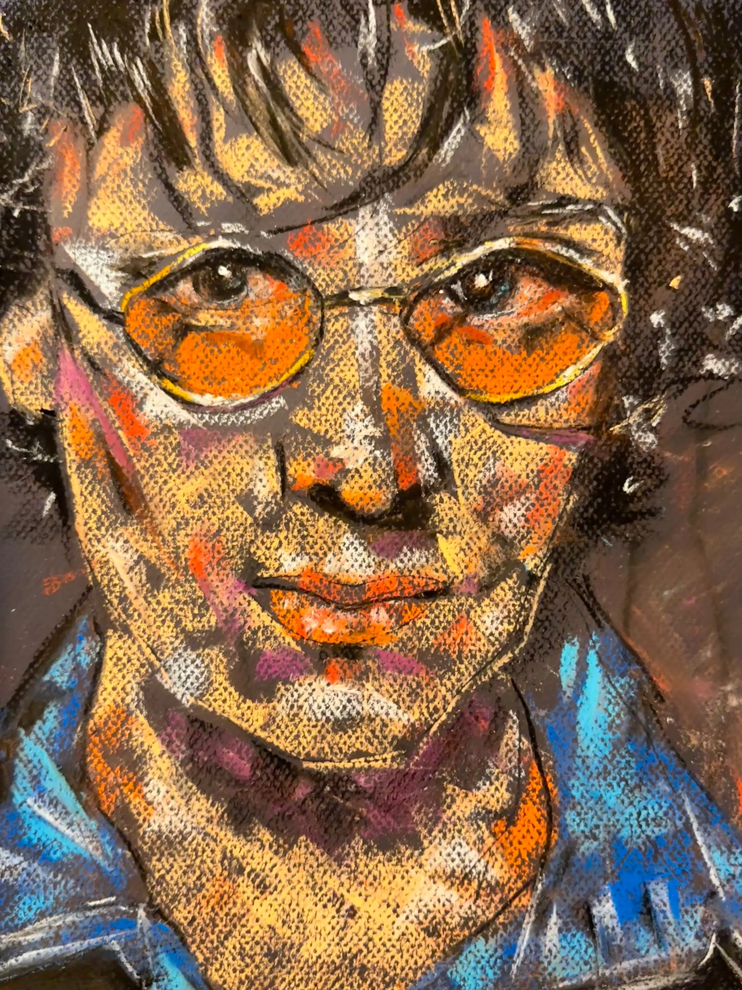 This was a quick sketch to see how the orange tinted glass would work with overlaying pastels to create the illusion of transparency. Exploring how the overlay of colours could distort or enhance the eyes underneath.