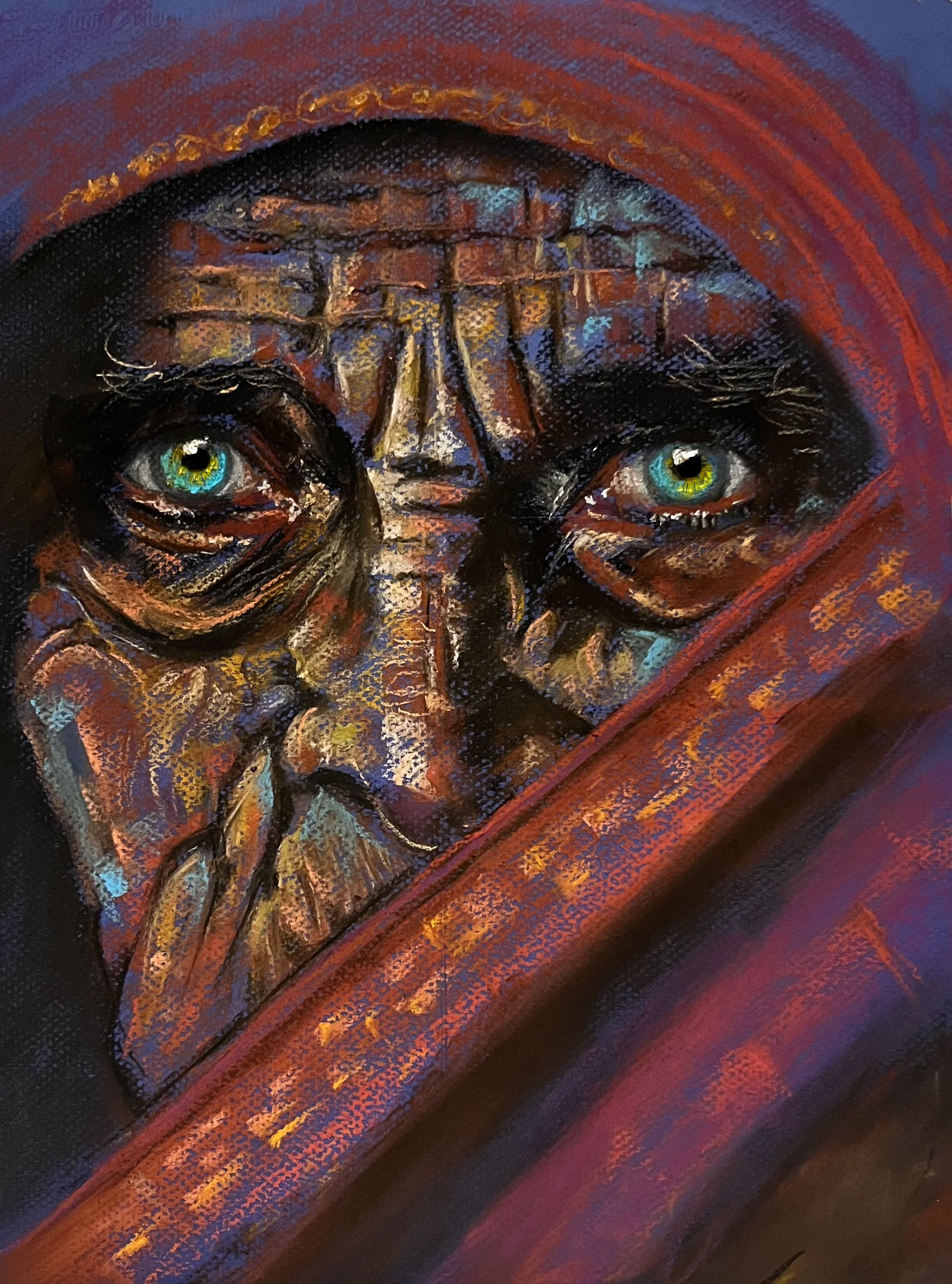 In this portrait, I tried to capture a gaze that feels both strong and deeply human. The bold, fractured colours on the skin are an attempt to suggest a life touched by intensity and survival, while the veil was meant to add a sense of mystery and quiet dignity.